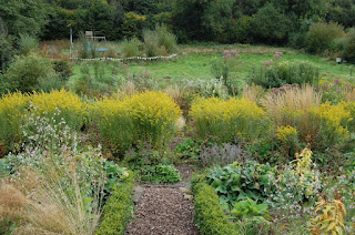 Its big sister is H. 'Sheila's Sunshine' which is the very tall (3m +) at the back here, not quite in flower yet, but primrose greeny-yellow when it does. Fantastically strong, but I suspect too tall for most people- who lets face it do not like being shorter than their perennials. Eupatorium 'Orchard Dene' in front - around the onepointsomething metre mark - again useful for those who can't cope with the 3m joe pye weeds.